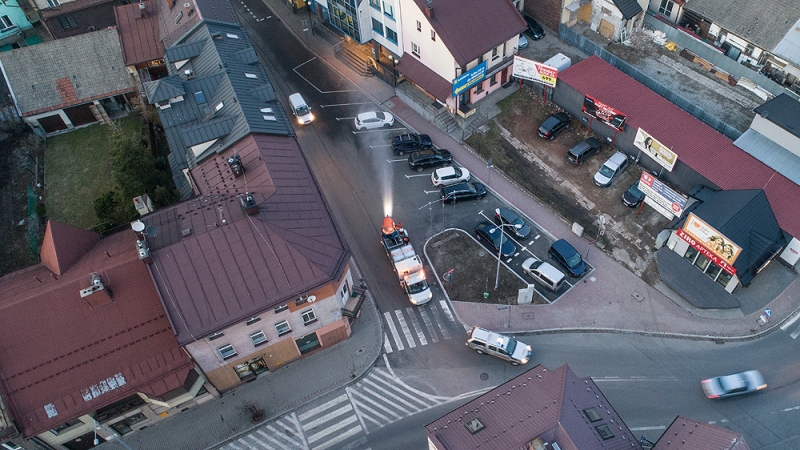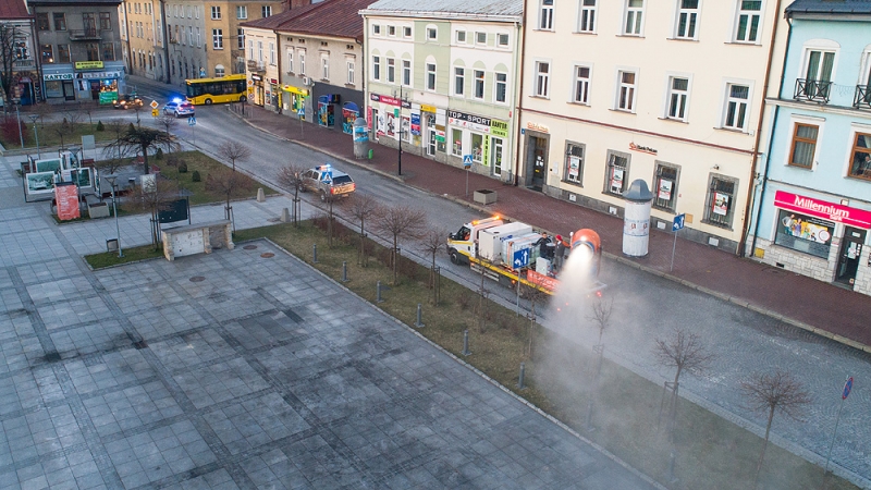 Včera popoludní bol dezinfekčný prostriedok rozprašovaný v centre mesta Nowy Targ pomocou snežného kanóna Supersnow. Veľkolepá akcia bola prvou svojho druhu v Poľsku, ale výrobca zbraní je pripravený konať.